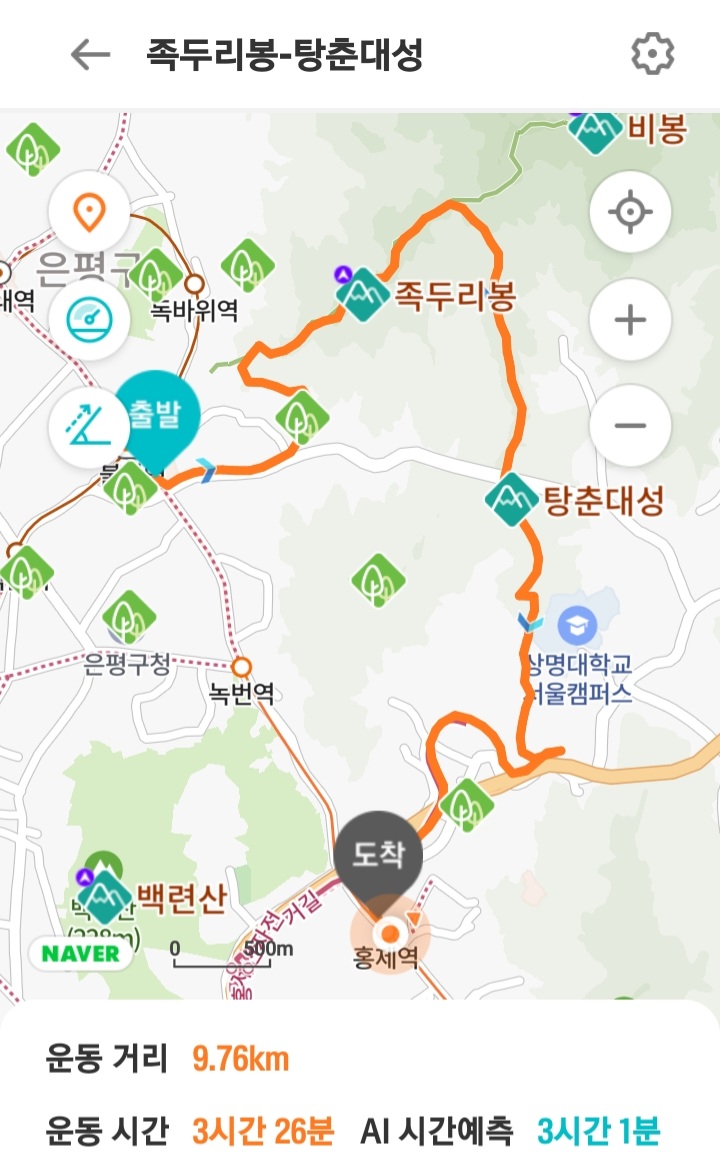 산행코스 : 불광역~둘레길 구름정원길 구간~족두리봉~탕춘대성암문~옥천암~홍제천~홍재 역