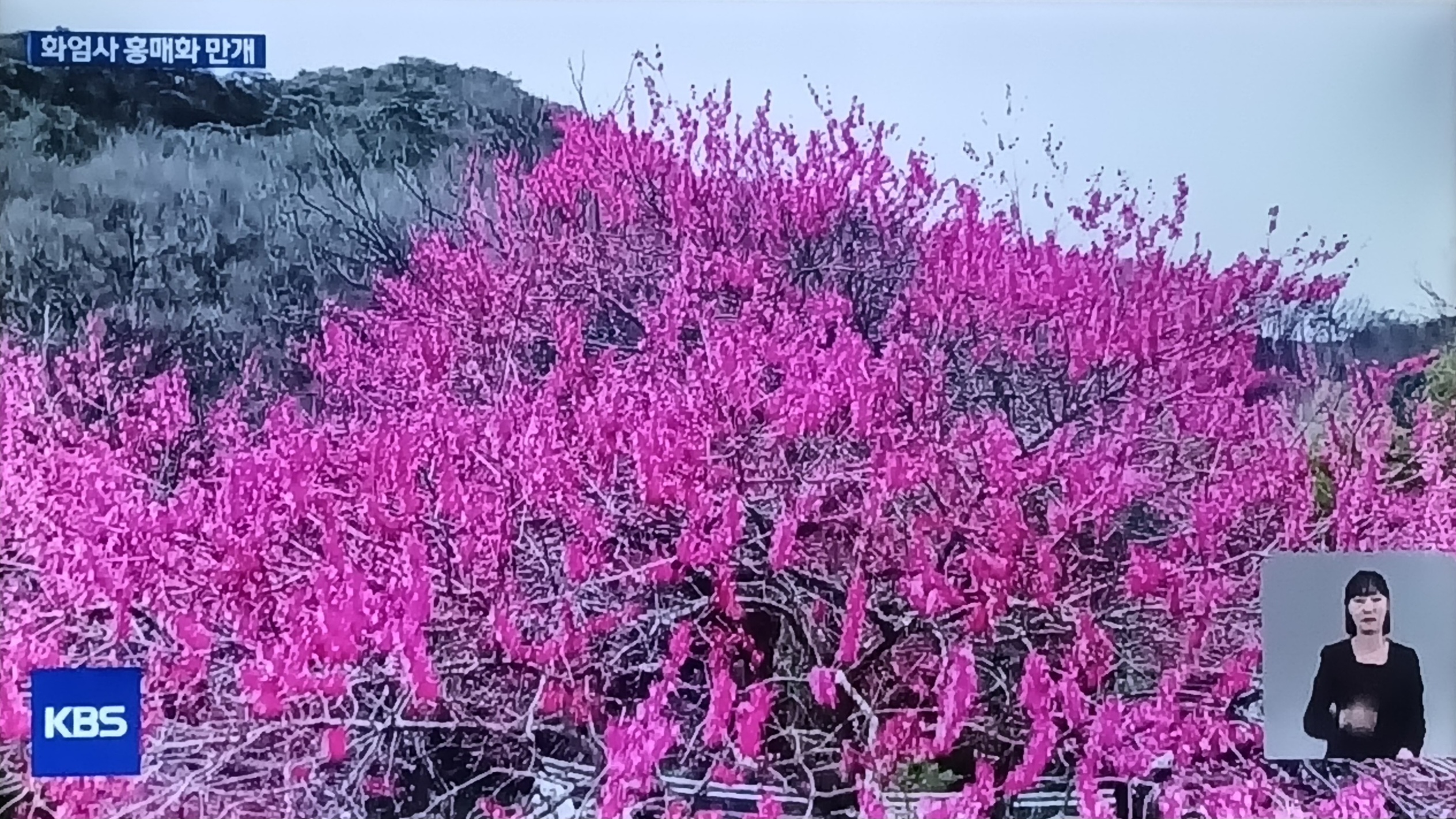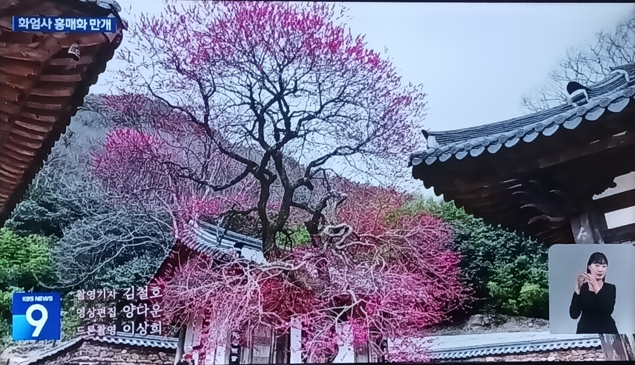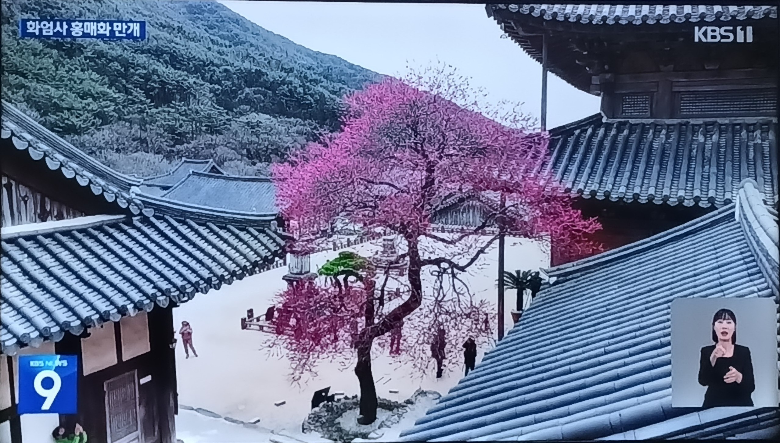 화엄사 홍매화가 워낙 유명하다보니,KBS뉴스에도 보도가 되고있네요, 너무 멀어 직접가지는 못해도 TV화면을 찍어 봤습니다.