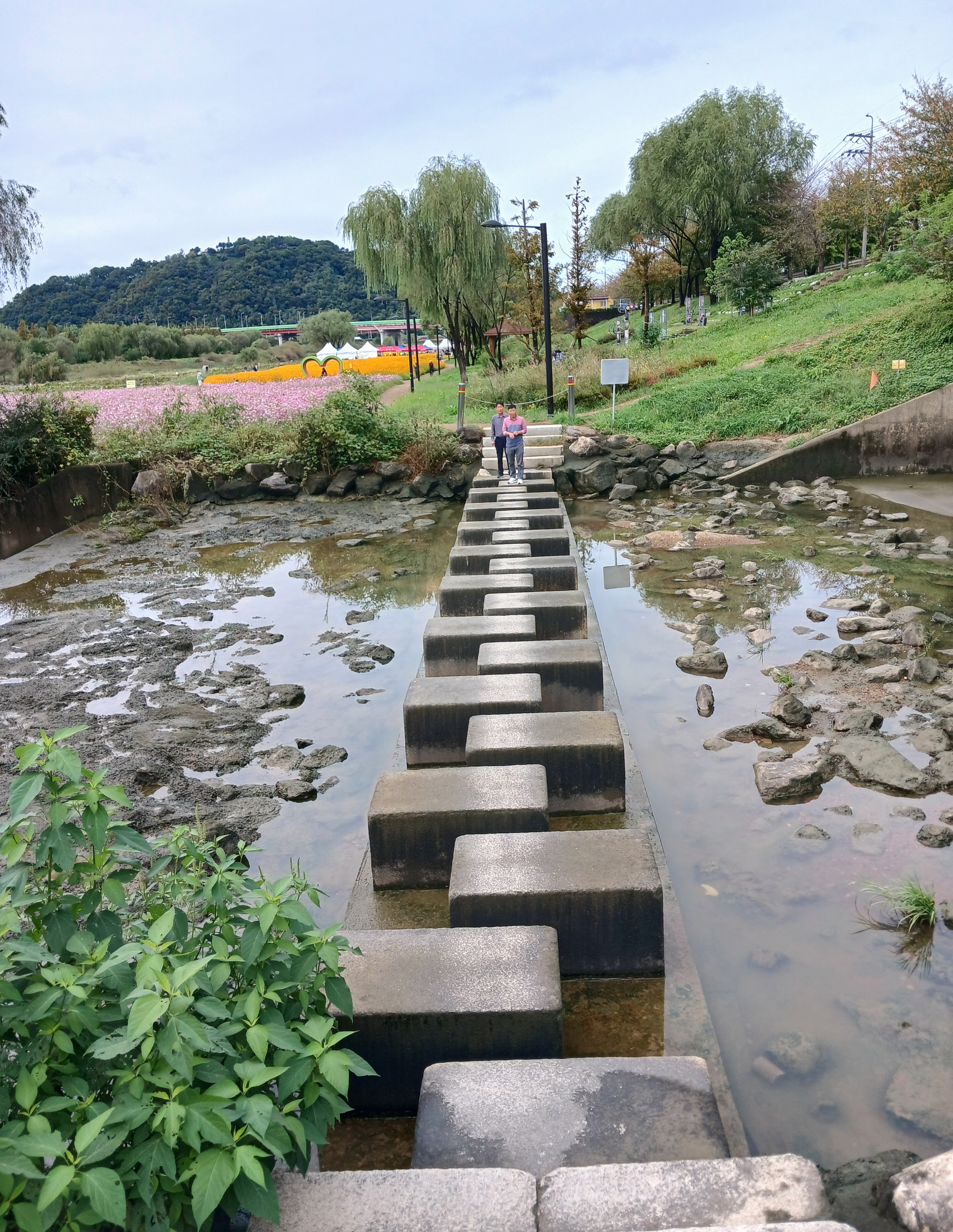 ▲징검다리를 건너 축제가 열리는 주차장 쪽으로...